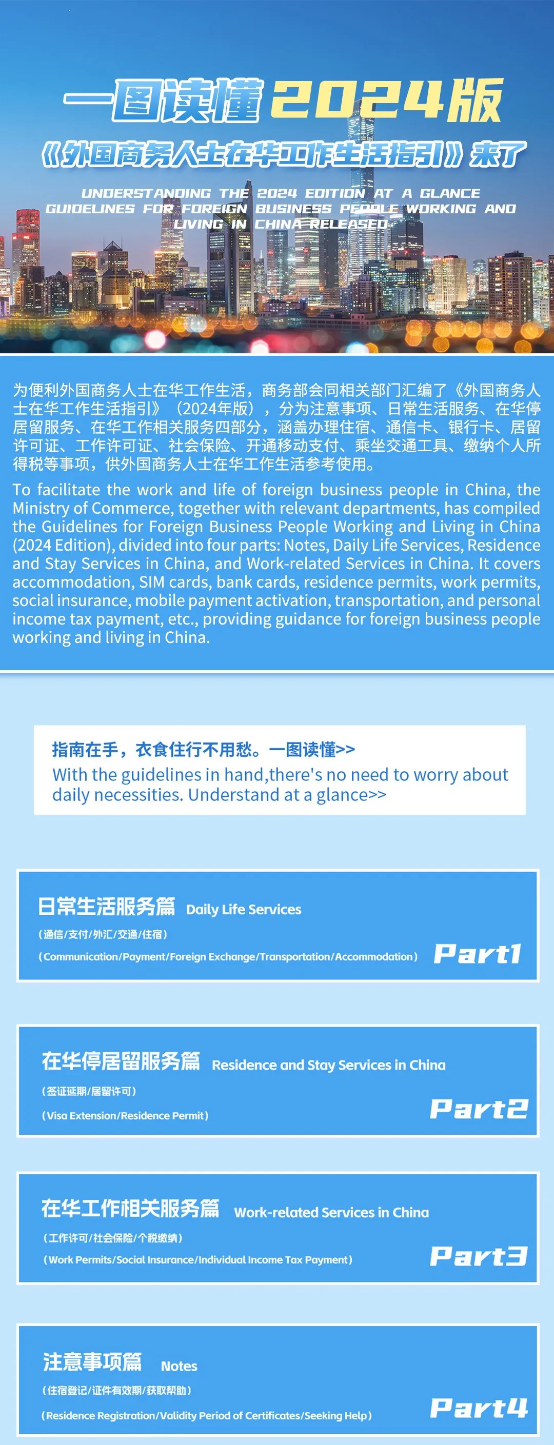 一图读懂 | 2024版《外国商务人士在华工作生活指引》(双语版)understanding the 2024 editon at a glance guidelines for foreign business people working and living in China released