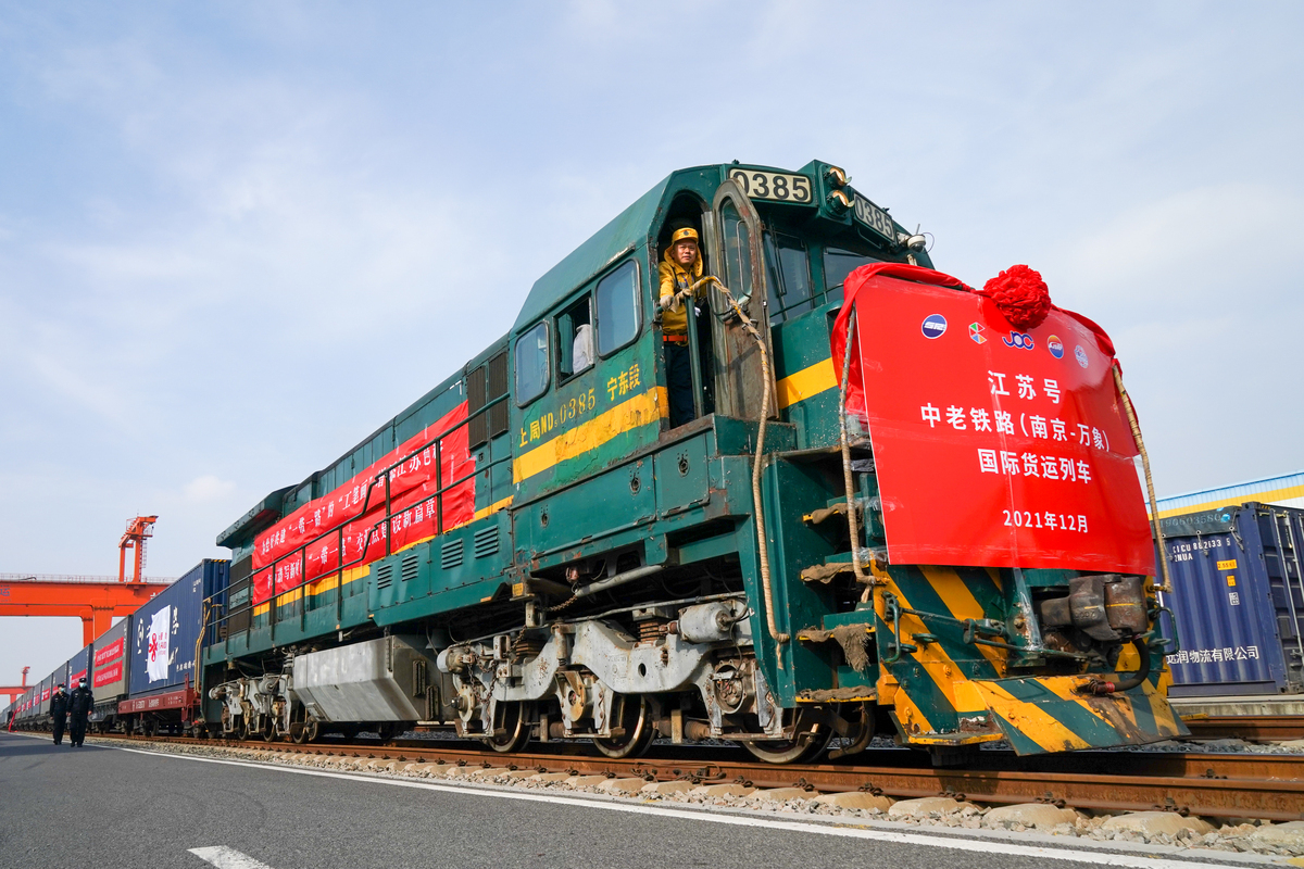 A China-Laos freight train with 76 containers bound for Vientiane, Laos, prepares to depart from Nanjing, Jiangsu province, on Dec 8. The RCEP has created the world's largest free trade bloc comprising ASEAN and five other nations, including China. [Photo/Xinhua]