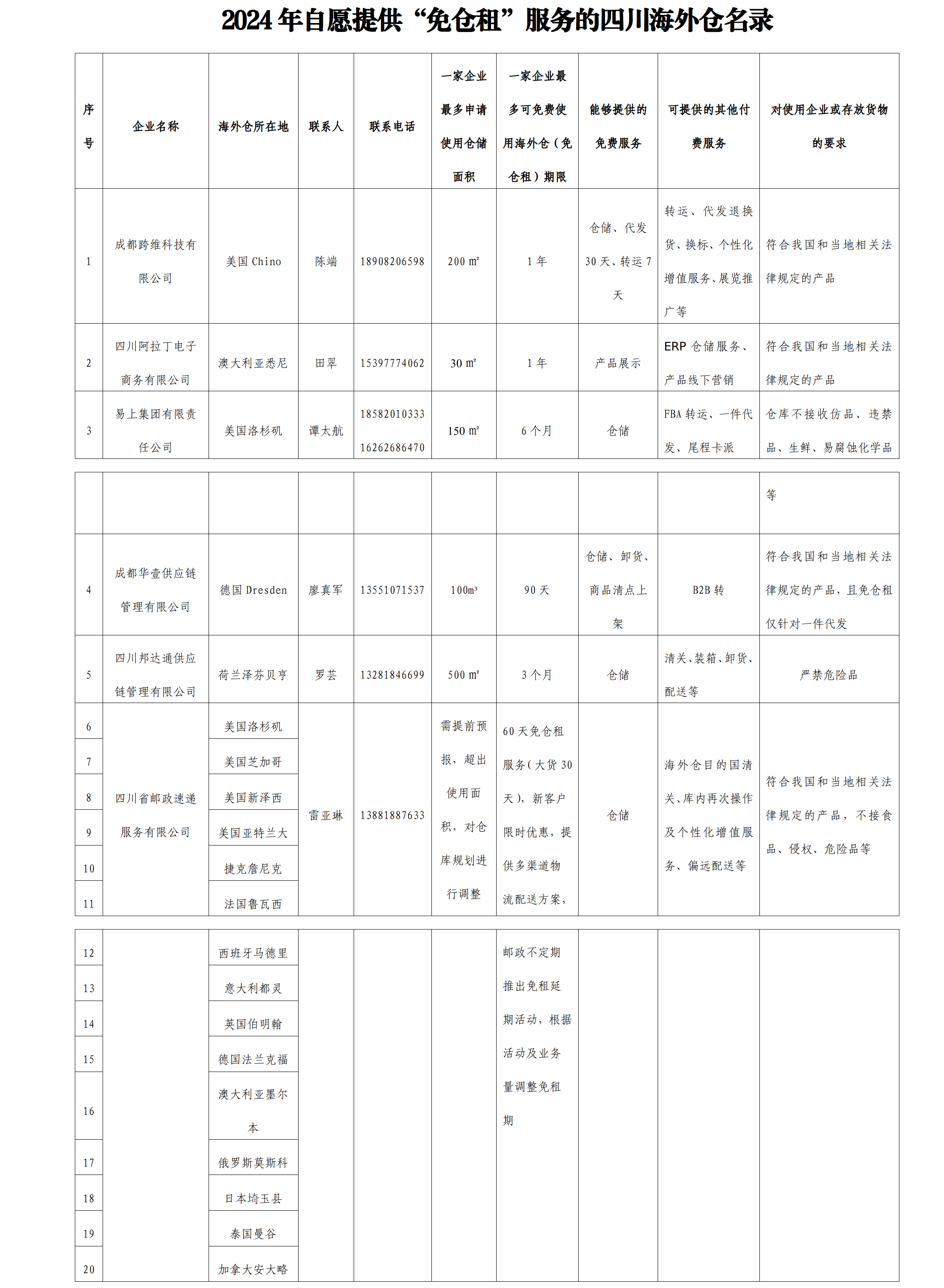 2024年自愿提供“免仓租”服务的四川海外仓名录