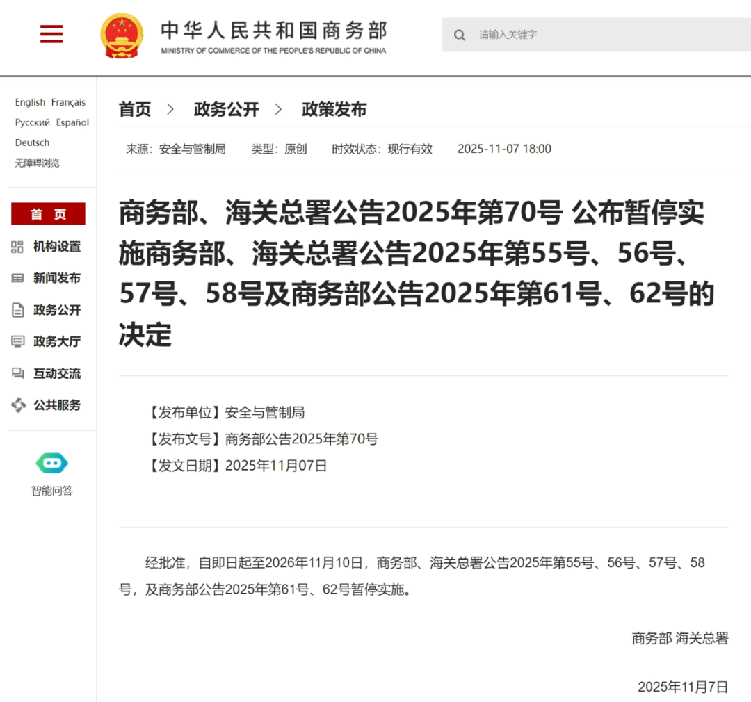 经批准,自即日起至2026年11月10日,商务部、海关总署公告2025年第55号、56号、57号、58号,及商务部公告2025年第61号、62号暂停实施。