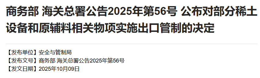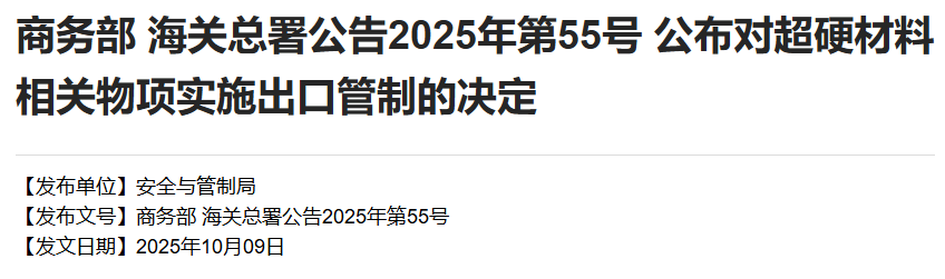 值得一提的是,第55号、56号、57号、58号公告是两部门发布的对涉及超硬材料、部分稀土设备和原辅料、锂电池和人造石墨负极材料、部分中重稀土等相关物项实施出口管制。