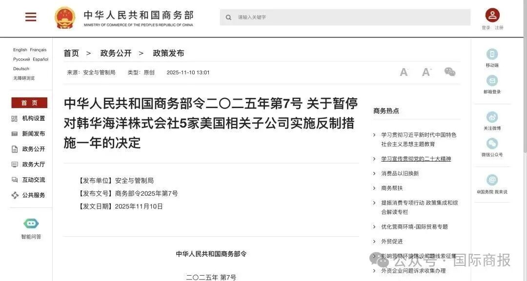 鉴于美方自2025年11月10日起暂停实施其对中国海事、物流和造船业301调查措施一年,商务部于11月10日发布2025年第7号令,关于暂停对韩华海洋株式会社5家美国相关子公司实施反制措施一年的决定,自2025年11月10日起施行。