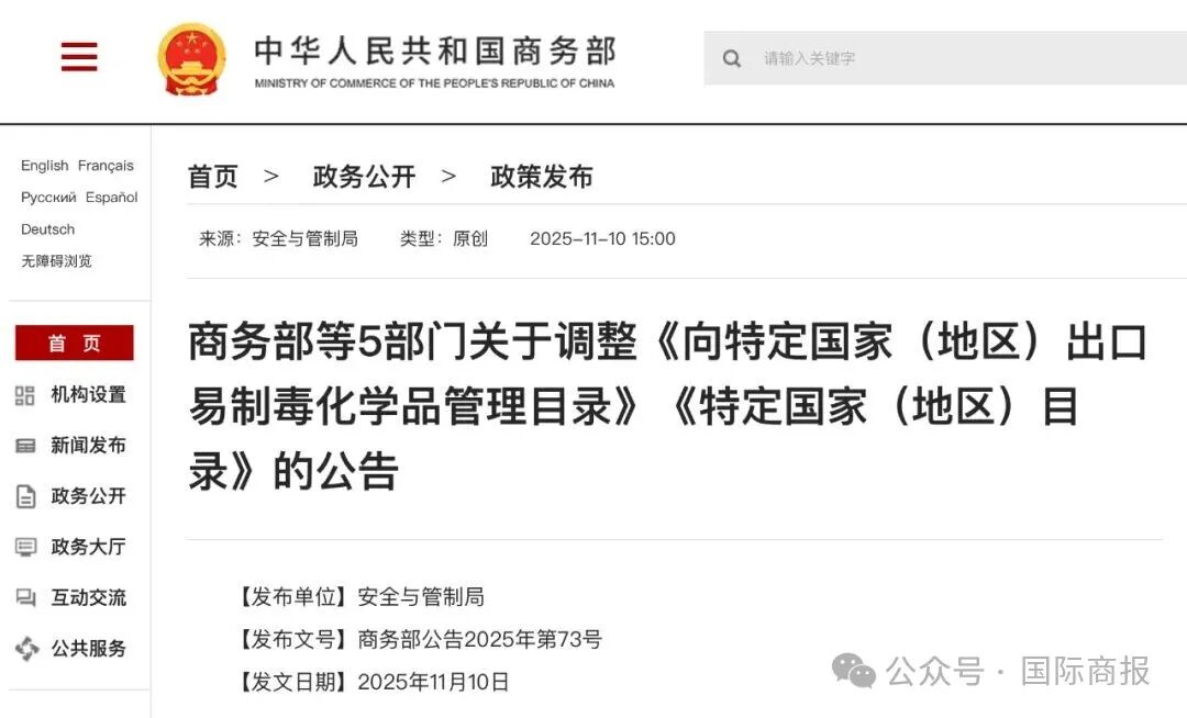商务部官网11月10日消息,为进一步做好易制毒化学品出口管理工作,根据《向特定国家(地区)出口易制毒化学品暂行管理规定》,商务部、公安部、应急管理部、海关总署和国家药监局决定对《向特定国家(地区)出口易制毒化学品管理目录》及《特定国家(地区)目录》进行调整,将美国、墨西哥、加拿大增列入《特定国家(地区)目录》,并单独增列针对上述3个国家的13种易制毒化学品。