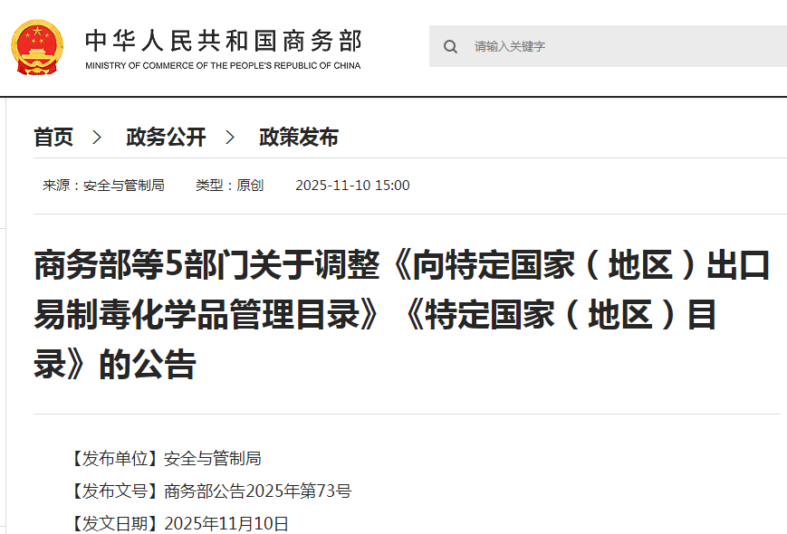商务部官网11月10日消息,为进一步做好易制毒化学品出口管理工作,根据《向特定国家(地区)出口易制毒化学品暂行管理规定》,商务部、公安部、应急管理部、海关总署和国家药监局决定对《向特定国家(地区)出口易制毒化学品管理目录》及《特定国家(地区)目录》进行调整,将美国、墨西哥、加拿大增列入《特定国家(地区)目录》,并单独增列针对上述3个国家的13种易制毒化学品。