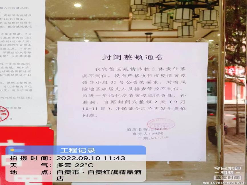 9月10日上午,自贡市高新区经济运行局联合辖区公安、卫健、市场监管等部门在对商务酒店疫情防控检查中,对疫情防控责任落实不到位的红旗宾馆开出了首张勒令封闭式整顿2天“罚单”,对全市商务主管行业市场主体起到了极大震慑作用,确保从严从紧从实抓好疫情防控各项工作措施。