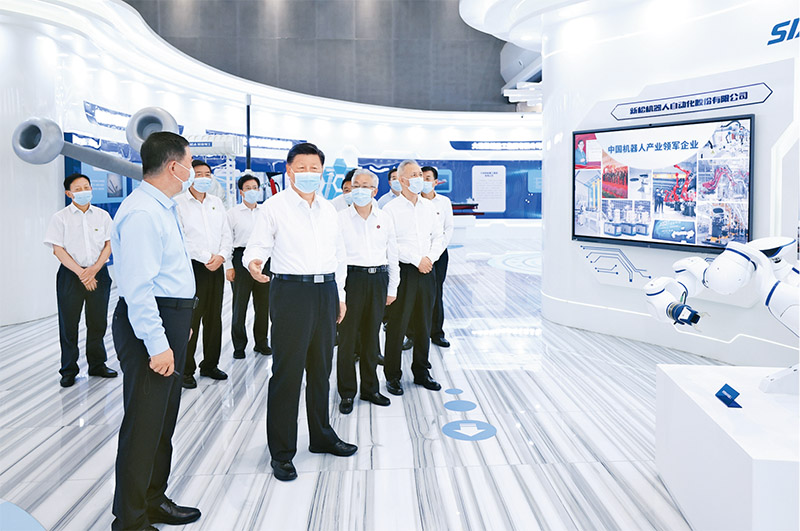 2022年8月16日至17日,中共中央总书记、国家主席、中央军委主席习近平在辽宁考察。这是17日下午,习近平在沈阳新松机器人自动化股份有限公司展厅,了解公司生产经营、自主创新情况。新华社记者鞠鹏/摄