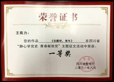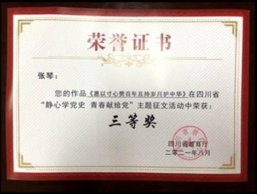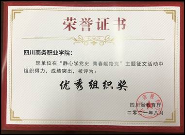 近日,四川商务职业学院学子在省教育厅主办的“静心学党史、青春献给党”主题征文比赛中荣获一等奖、三等奖各一个。学院因组织得力,成绩突出,被评为“优秀组织奖”。