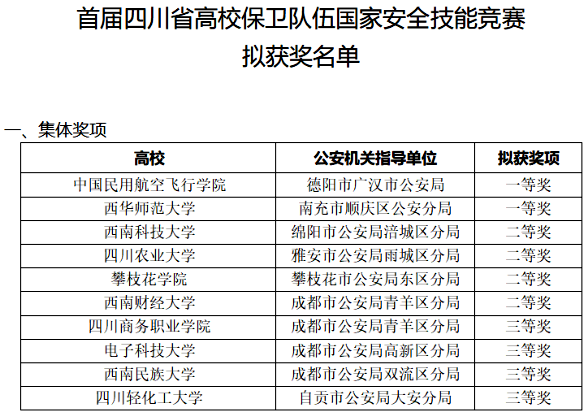 | 10月20日,四川省教育厅公示了首届四川省高校保卫队伍国家安全技能竞赛拟获奖名单。在这场云集了全省141所高校精英队伍的激烈角逐中,经过片区复赛的严格筛选,最终有21所高校脱颖而出、会师决赛。四川商务职业学院代表队在决赛中发挥出色,最终荣获决赛三等奖。