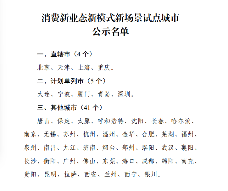 | 近日,商务部、财政部确定全国50个城市为消费新业态新模式新场景试点城市,我省成都市、绵阳市、南充市3市入选,入选数量居中西部省份第1、全国前3,