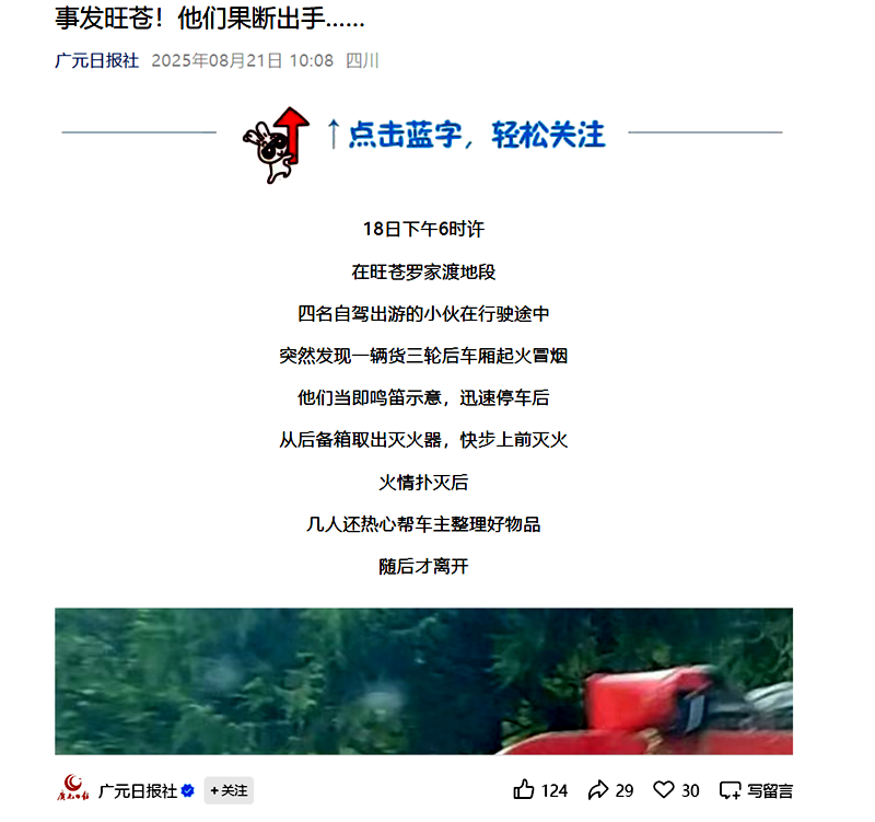 谈及救火举动,陈凤鸣和同伴表示“只是举手之劳,能帮就帮”。这句朴实的话语,折射出他们内心的善良与勇敢。这一暖心事迹获得了现场群众的一致好评,并被《广元日报》报道传播,为社会注入了一股正能量暖流。
