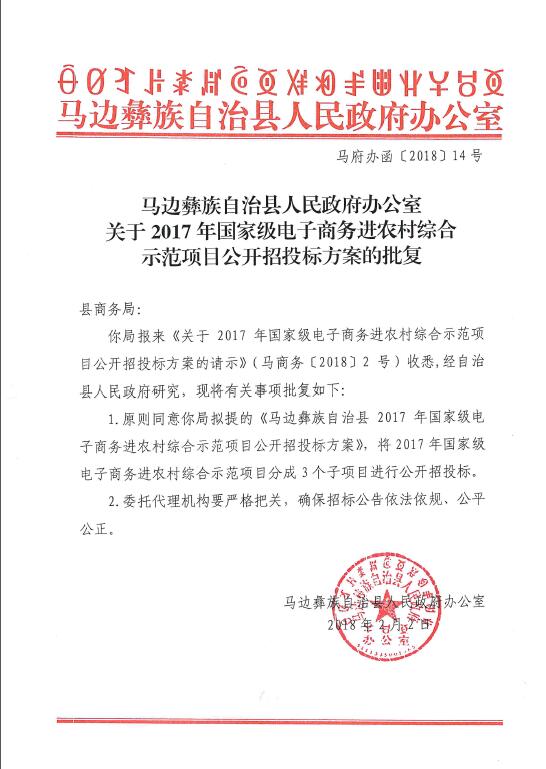 马边彝族自治县人民政府办公室关于2017年国家级电子商务进农村综合示范项目公开招投标方案的批复